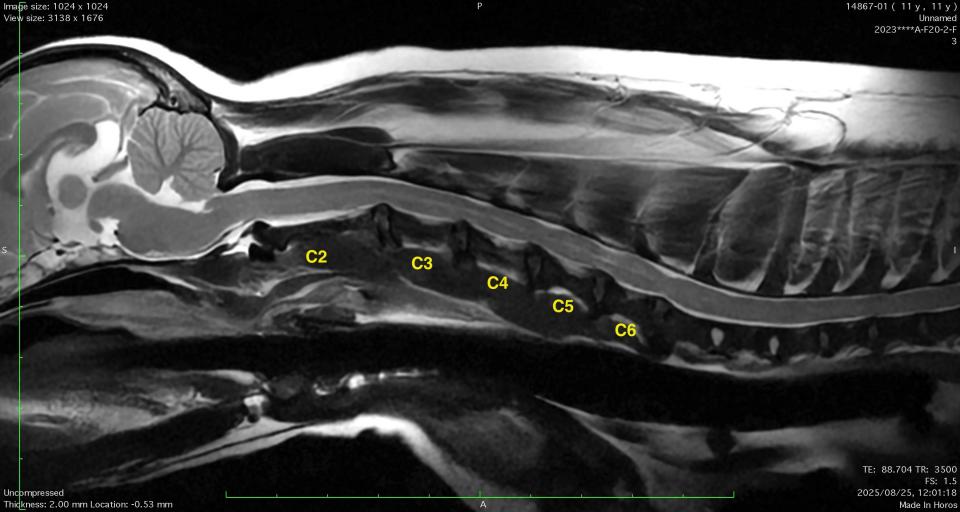 鑑別診断として椎間板ヘルニア、椎間板関連動的圧迫、髄膜炎などが考えられました。髄膜炎や腫瘍の除外のためMRI検査を実施しました。