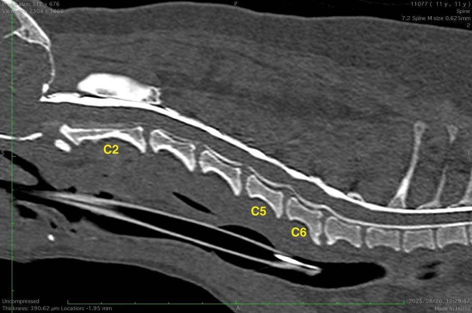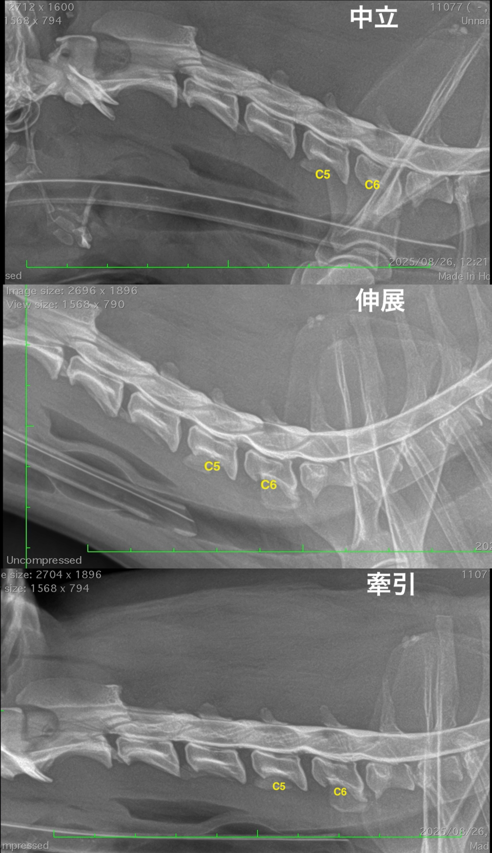 本症例は脊髄造影検査および脊髄造影ダイナミック検査を実施することで、C5-6椎間の椎間板ヘルニアおよび脊椎不安定症と診断することができました。