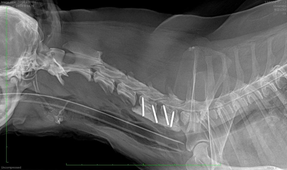 歩行不可能な四肢不全麻痺および運動失調が認められ、頚部脊髄障害のグレード3と評価しました。