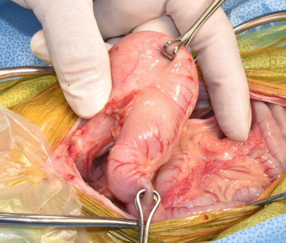 BCS 1/5で重度に削痩し、血液検査で重度の貧血、低血糖、電解質異常などが認められました。腹部超音波検査/CT検査では幽門から十二指腸にかけて腫瘤性病変が認められ、胃うっ滞がありました。明らかな転移所見は認められませんでした。