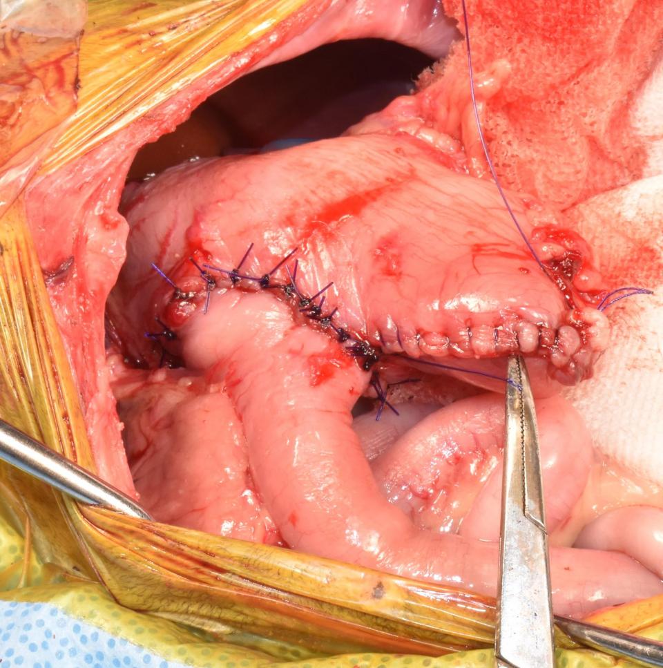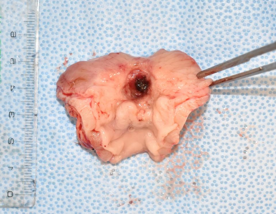 輸血を行って手術に臨みました。CTおよび術中所見に基づき、幽門切除術および胃十二指腸吻合術(ビルロートI型)を行いました。胃の腫瘤形成部は潰瘍が形成されていました。病理検査の結果は胃腺癌でした。