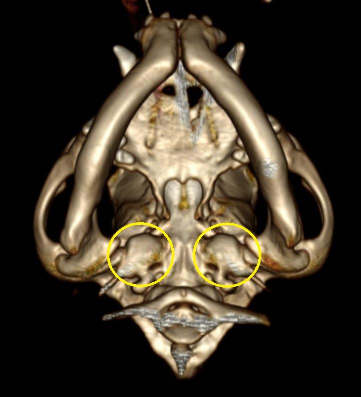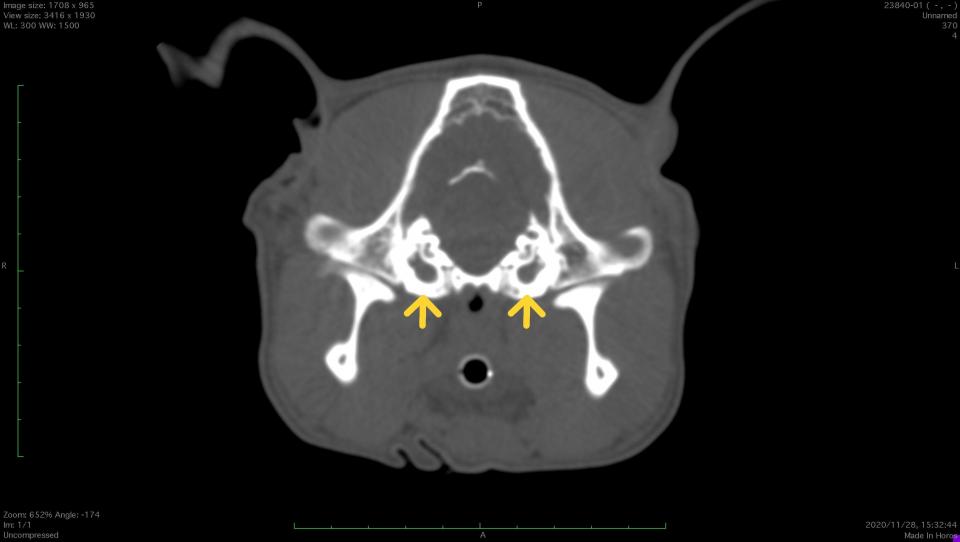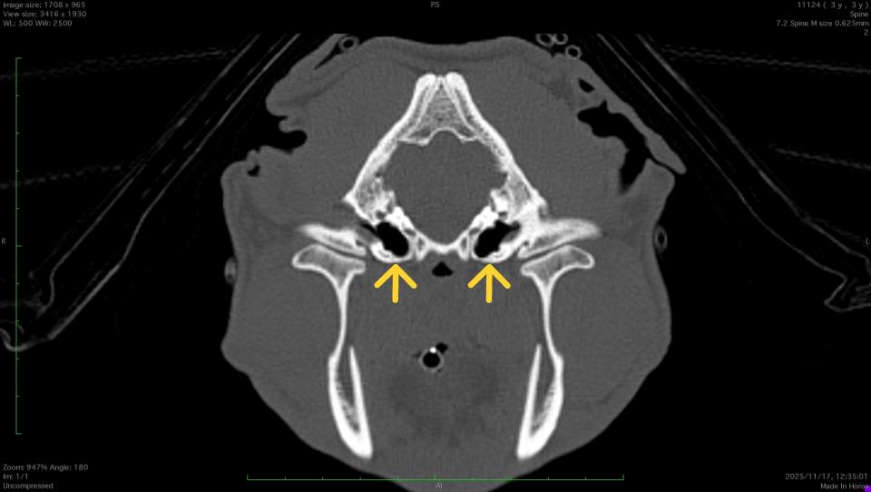 一方、本症例では液体や軟部組織で鼓室胞内が満たされていることがわかります。